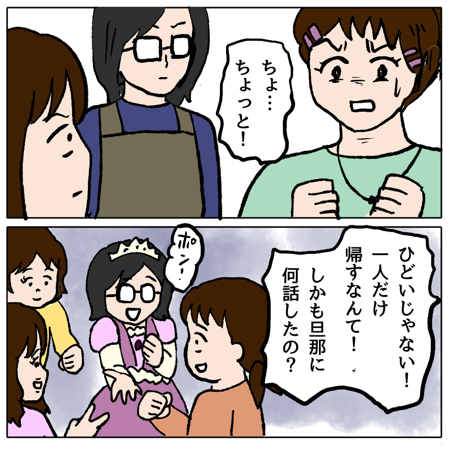 この4人のママたちはおとなしいグループだから、わざわざ噂好き、気の強い人たちに情報提供しないだろうけど、週明けの幼稚園で、イヤ〜とんでもなかったわ!て触れ回りたい衝動に駆られる。