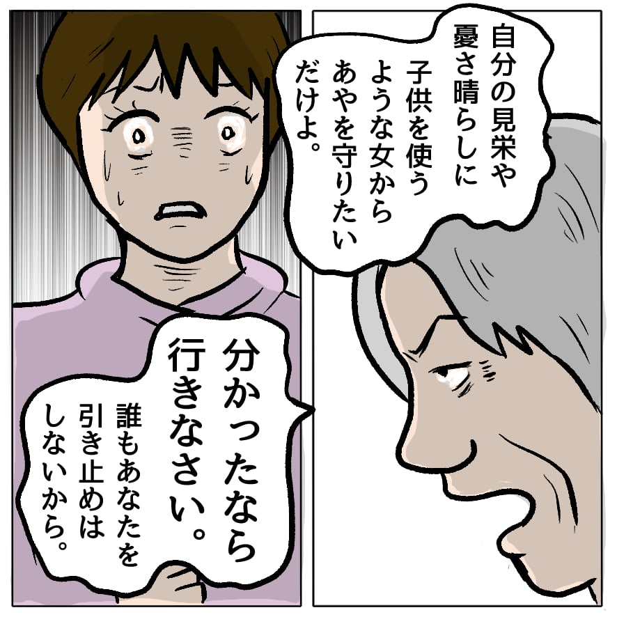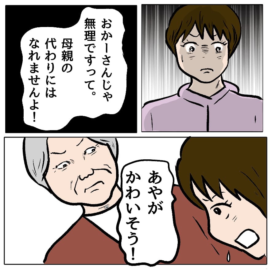 「あやがかわいそう!」のコマのお祖母様のきりりっとしたお顔が頼もしい。