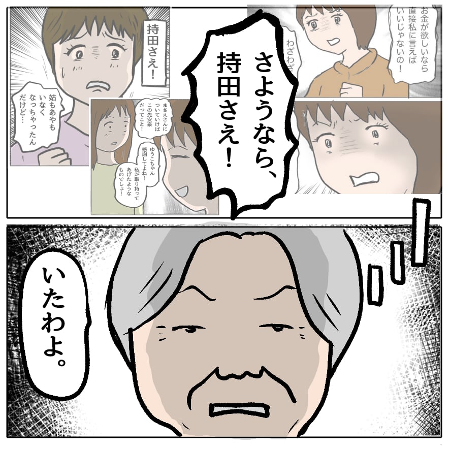 持田さえなんか、心情的には、素っ裸で家から叩き出すくらいでちょうど良いとは思うけど、ここまで至った片棒を、あんたのバカ息子も担いでるんだから、当面の生活費として、手切れ金位はやつの額に叩きつけてから追い出すんだよねえ…?