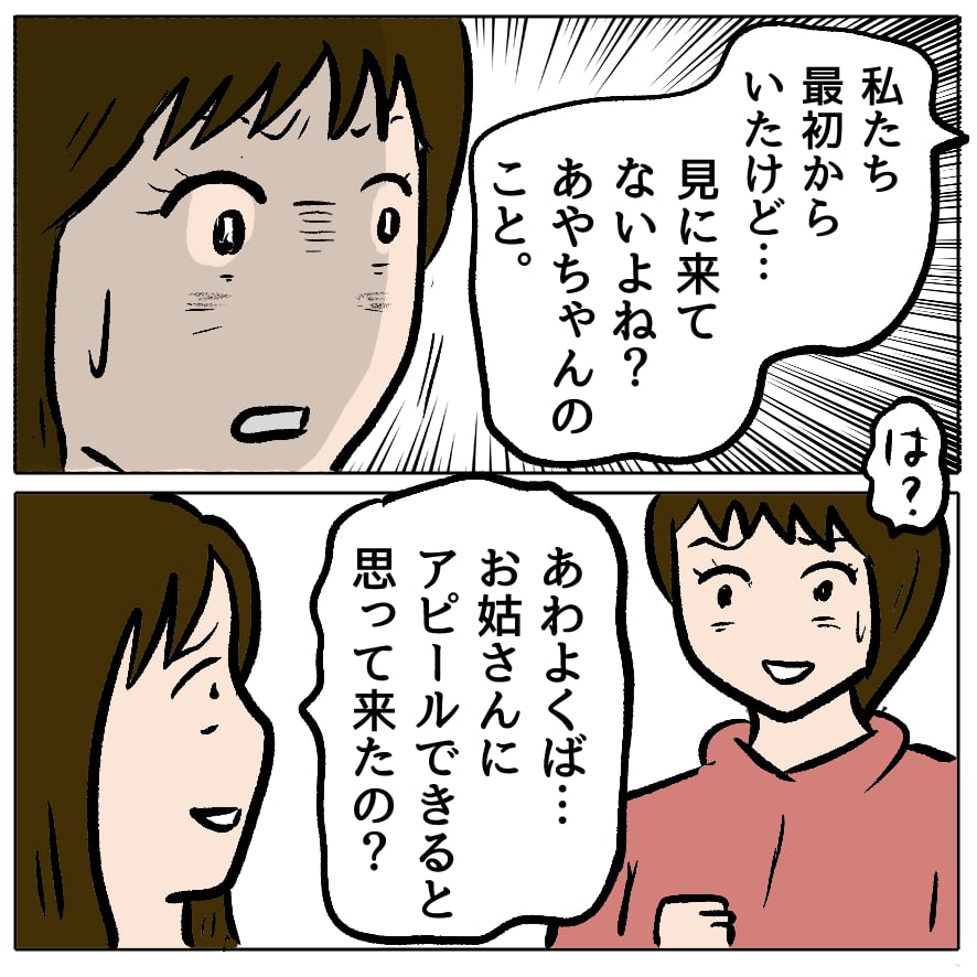 さえちゃんって、本当に自分のことしか頭にないんですね。姑さんへの許しを乞うのが目的だとしても、学校に来たのにあやちゃんの様子を全く見ていない・気にもかけないなんて…。親として本当にありえないです。親としても人としても、害悪でしかない。