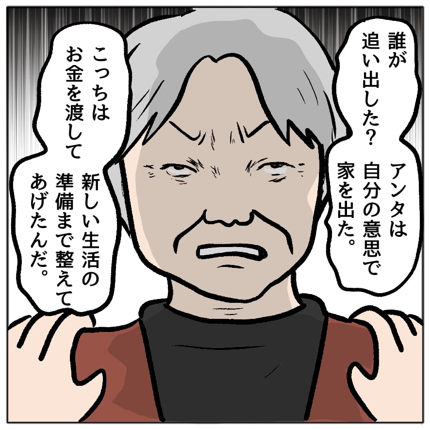 この状況なら、いくら『私は追い出された』と主張しても通りませんね。確かにお金もらって自分から家を出てるから。