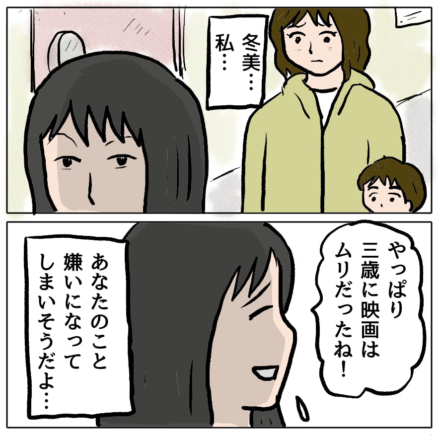 いやいやいやいやいくら何でも3歳児に映画とか絶対ぇ周りの迷惑になるよね?嫌いになって当然だと思うんですけど…あとトイレから出て来た冬美ちゃん怖すぎなんですが(笑)