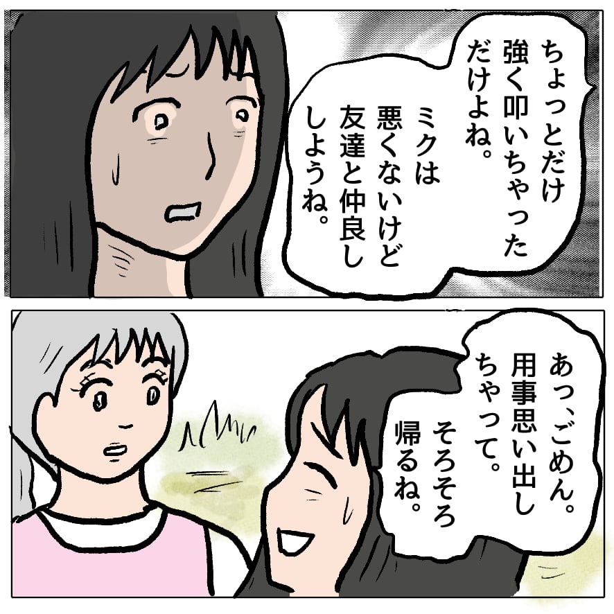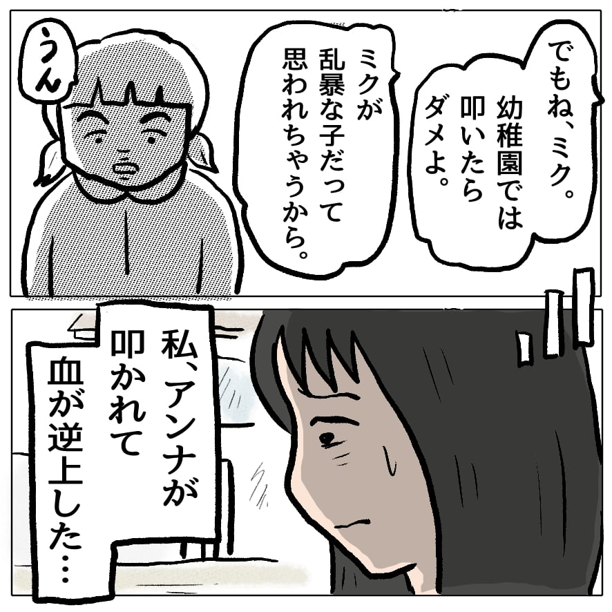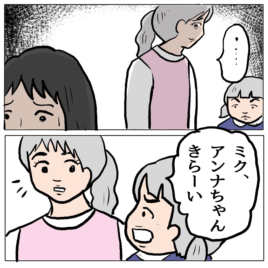 「アンナを嫌いな気持ちは肯定するが幼稚園では表に出すな」は間違いとは言えないけど、正しいフリだけして誤魔化すという点では教育になってないし、ミクの乱暴さは直さなくていいんだろうか…